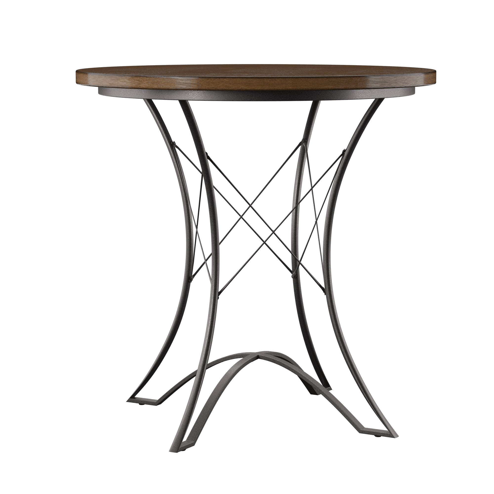 Styling details include arched table base with wire stretchers and hand-tooled metal stool bases with stretchers