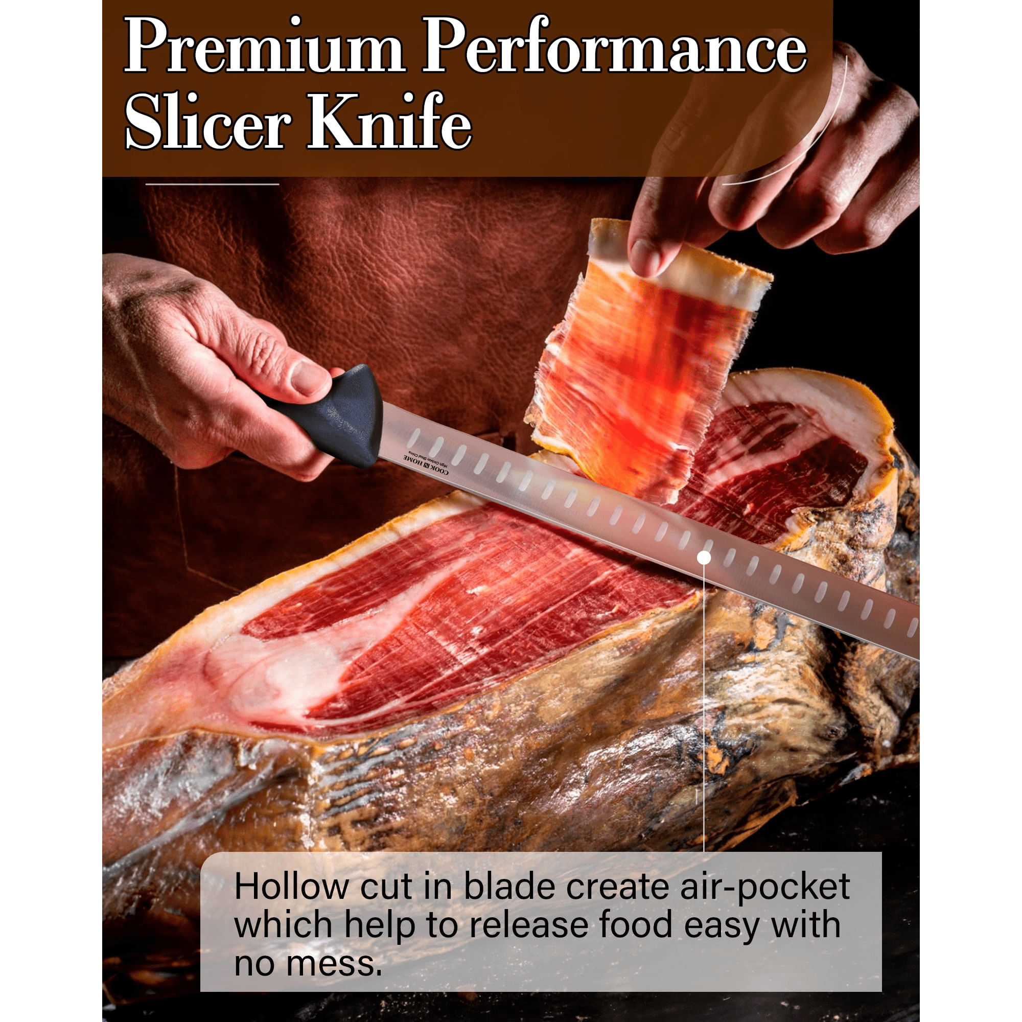 Cook n home slicing carving knife roast/fish slicer 11-inch, granton edge high carbon stainless steel sharp kitchen knife, ergonomic handle,black cook n home 11-inch granton edge slicing knife roast/fish slicer, high carbon stainless steel sharp kitchen knife this pro-grade slicing carving knife can easily handle all your kitchen tasks. Multipurpose for baked goods, meats, vegetables, fruits, etc. Ergonomic handle. Easy care.