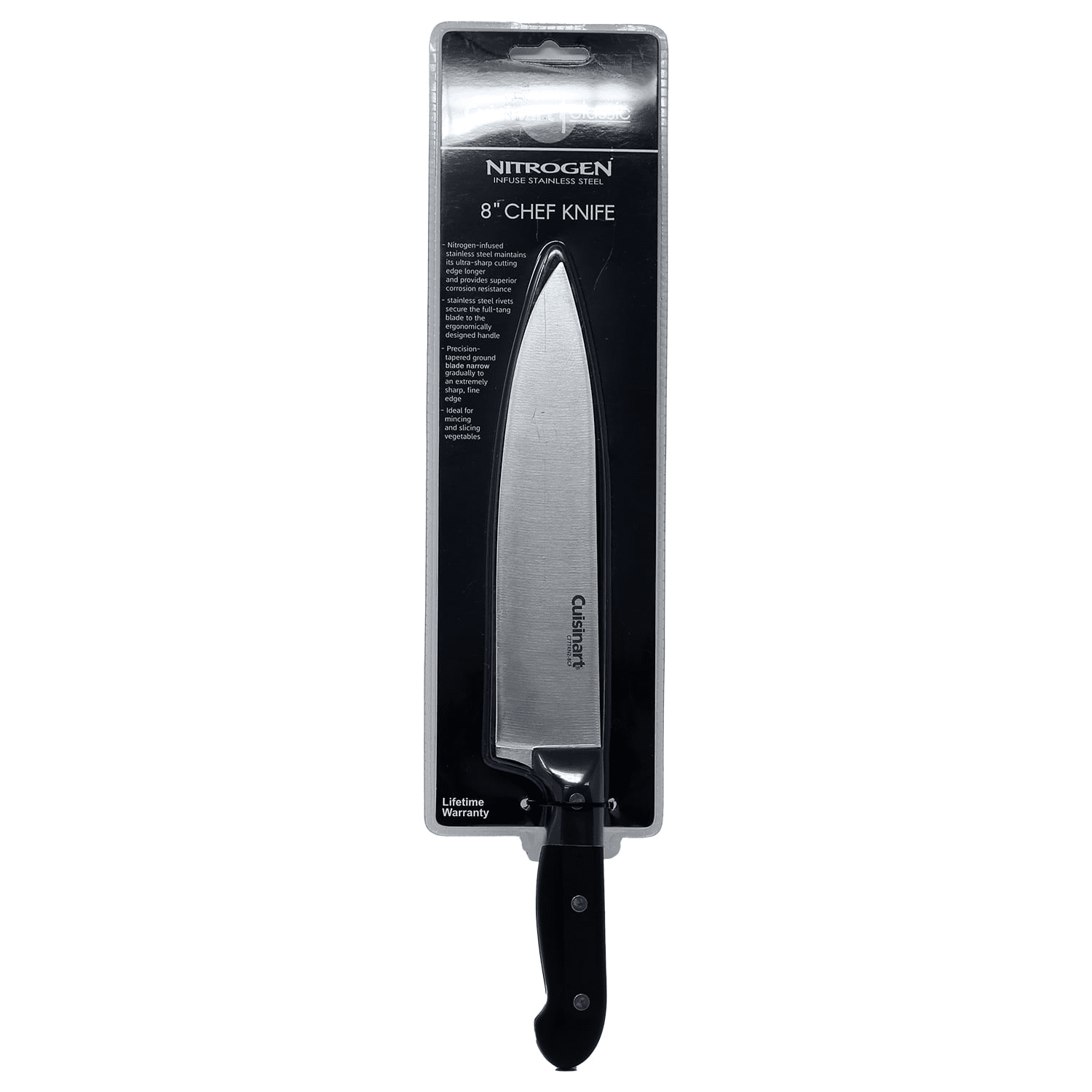 Introducing the cuisinart classic triple rivet 8" chef knife - nitrogen collection. The knife blades are crafted from stainless steel infused with nitrogen for long-lasting sharpness and to optimize strength and resistance to corrosion. These chef-caliber knives complement a wide range of personal style and kitchen decor.