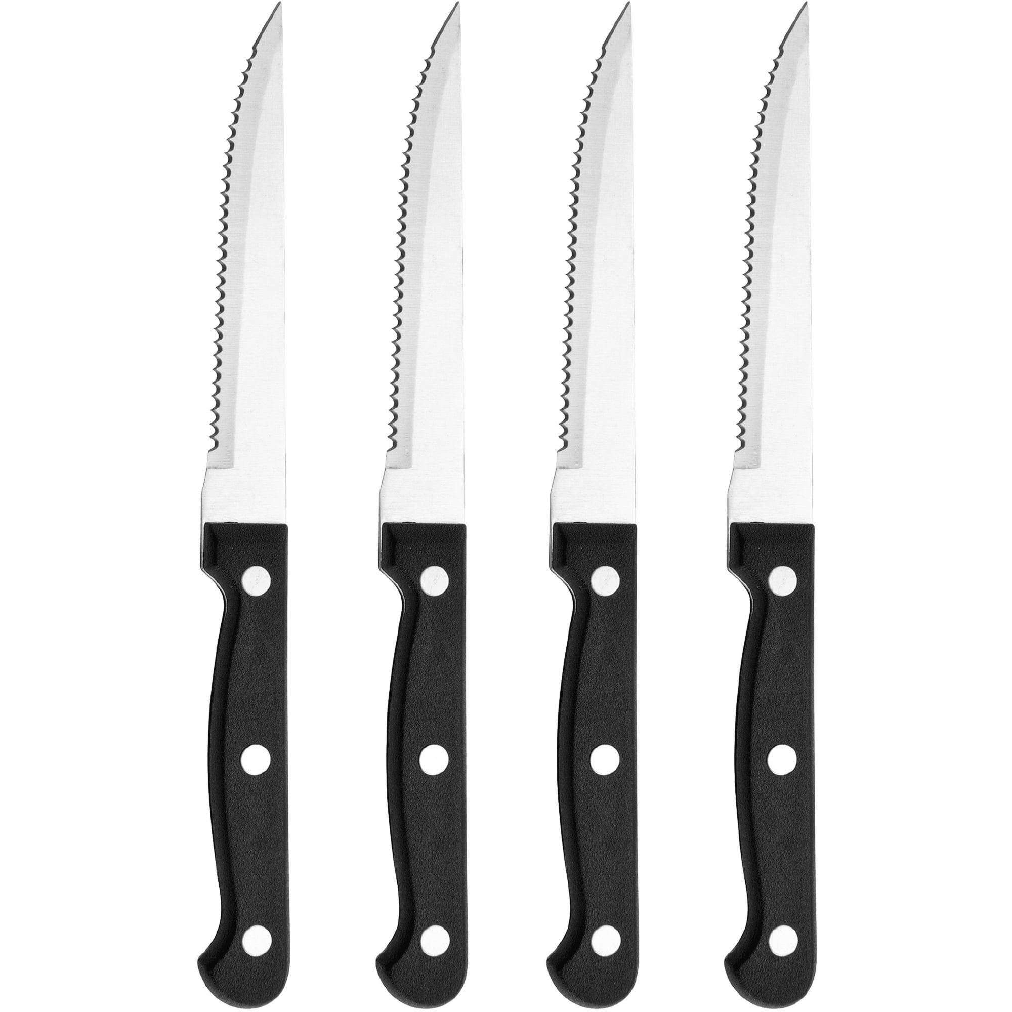 This farberware stamped triple rivet steak knives set features a serrated carbon stainless steel blades. Each set includes 4 knives. Each knife has a high carbon stainless-steel blade for strength and durability. The serrations on blade are perfect for cutting meat and poultry. Each knife has a full tang triple rivet handle. Hand-wash with warm water and a mild detergent; rinse and dry immediately.