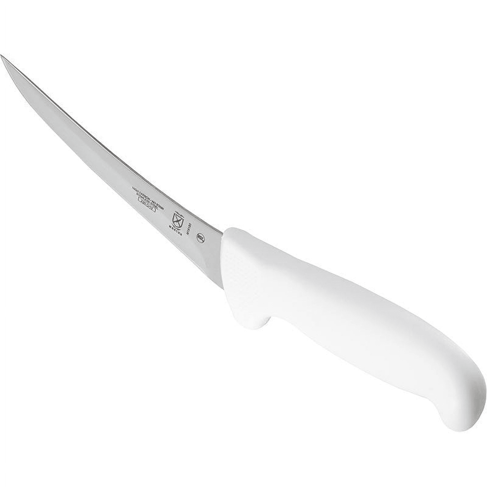 This ultimate white 6-inch curved boning knife is made with the highest quality japanese steel for easy edge maintenance and rapid sharpening for a razor-sharp edge. The curved blade provides a better working angle when cutting close to and around the bone. The boning knife contains a one-piece high carbon, stain-free japanese steel and a polypropylene handle.