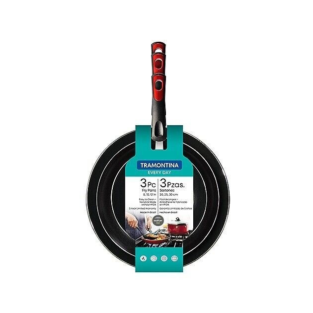 Tramontina’s Everyday 3 Pk Aluminum Nonstick Fry Pans in Metallic Red is a busy cook’s best friend. You’ll have the ideal pans for frying foods for intimate meals or for sautéing, stir-frying, and searing more portions for bigger meals. The fry pans are made with an aluminum construction for reliable and quick heat distribution. The pieces feature a metallic red finish for added color in your kitchen, and pairs perfectly with the cookware’s charcoal gray interior finish. The cookware's nonstick interior protects the cooking surface from sticking to the surfaces for mess-free meal prep. You’ll get safe and easy maneuverability thanks to the cookware’s ergonomic bakelite handle. The dishwasher-safe pans are compatible with gas, electric and ceramic glass cooktops, and are offered under a five-year limited warranty. Made in Brazil.