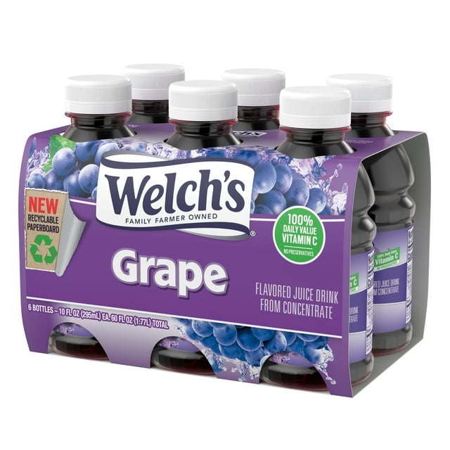 A delicious grape drink, in a perfect on-the-go size. Every bottle of Welch's Grape Drink provides 100% Daily Value of Vitamin C, with no artificial flavors or red 40. And you can feel great about buying Welch's, because we're owned by family farmers who have been farming their land for as many as seven generations. This is a 6 pack of 10 fl. oz. bottles, each perfect to enjoy on the go.